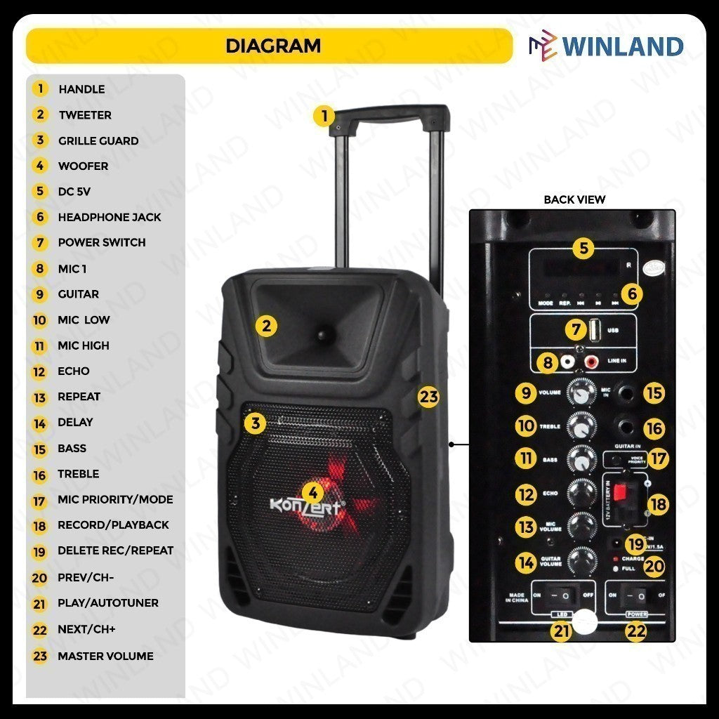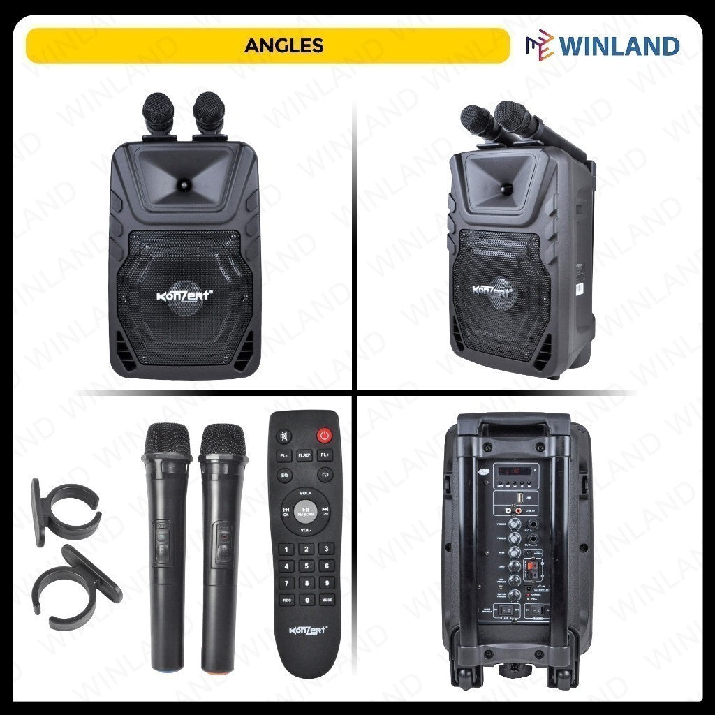 Konzert by Winland 8"200W Portable Rechargeable Speaker w/ USB/SD, FM Radio,BT & 2 Wireless Mic PA-8