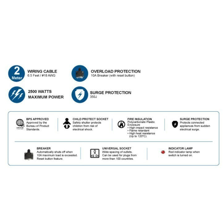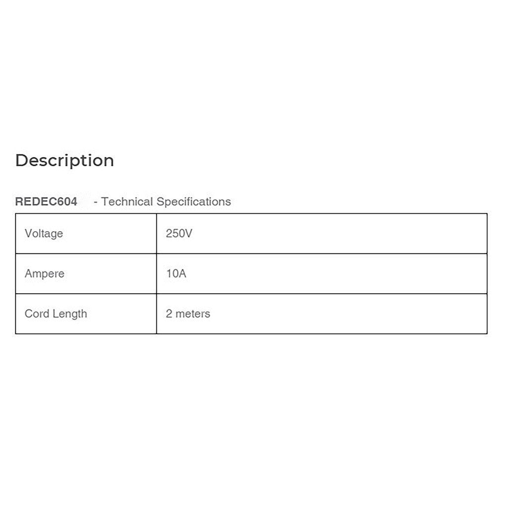 Royu 4 Outlets 2 Meter Extension Cord Cable Wire Overload & Surge Protection REDEC604
