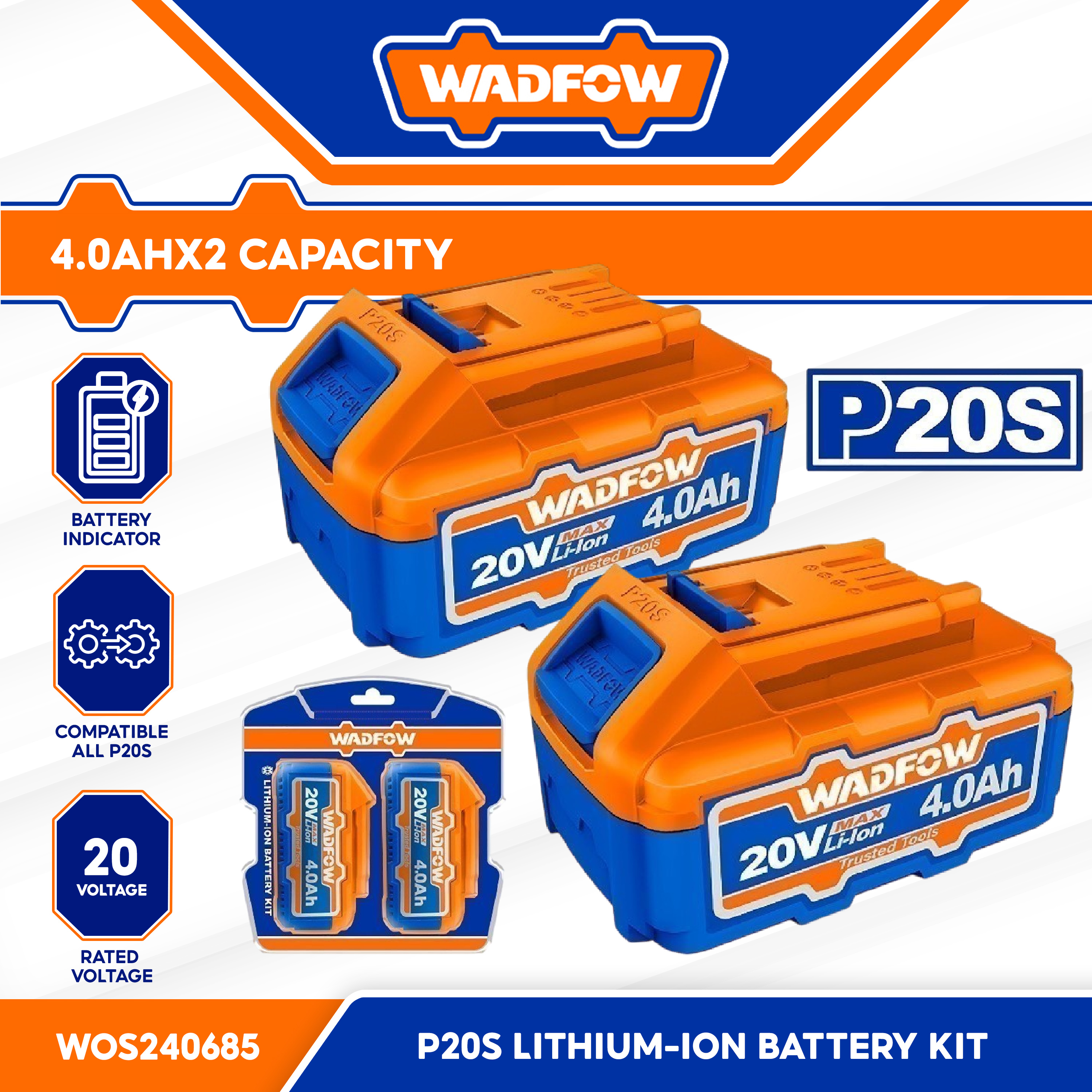 Wadfow by Winland 2PCS/SET P20s/20v Lithium-Ion Battery Pack For Cordless Power Tool 4.0Ah WOS240685