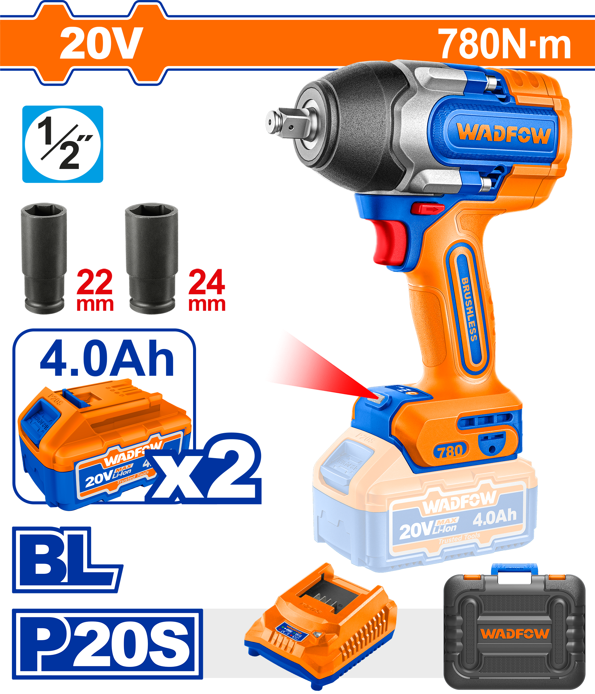 Wadfow P20S/20V Brushless Motor Lithium-Ion Cordless Impact Wrench 780NM WCD1B78 WAD-CT