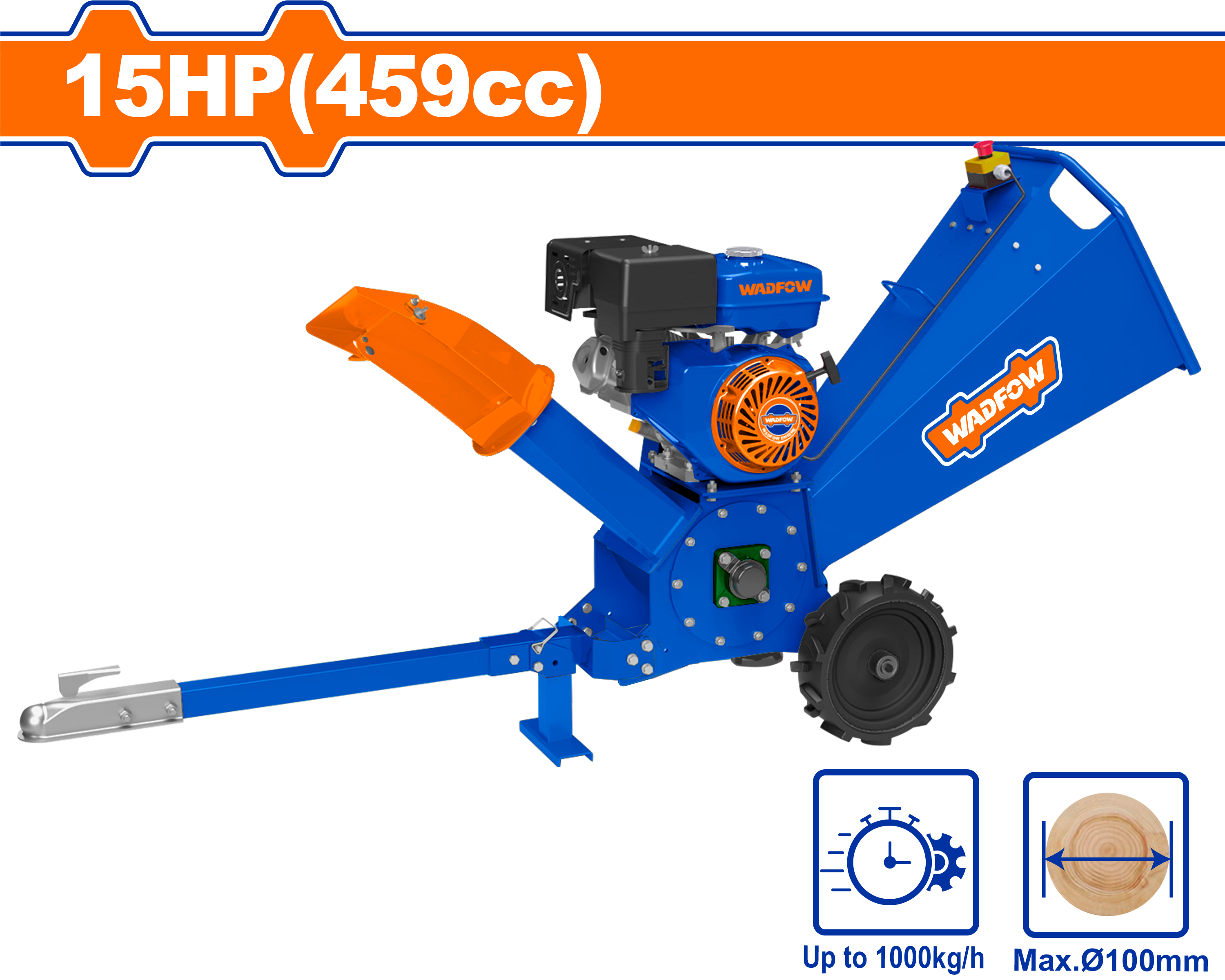 Wadfow WXU1315 Gasoline Wood Chipper. Powered by a robust 15HP (459cc) engine, this chipper delivers heavy-duty performance designed for commercial and industrial use.